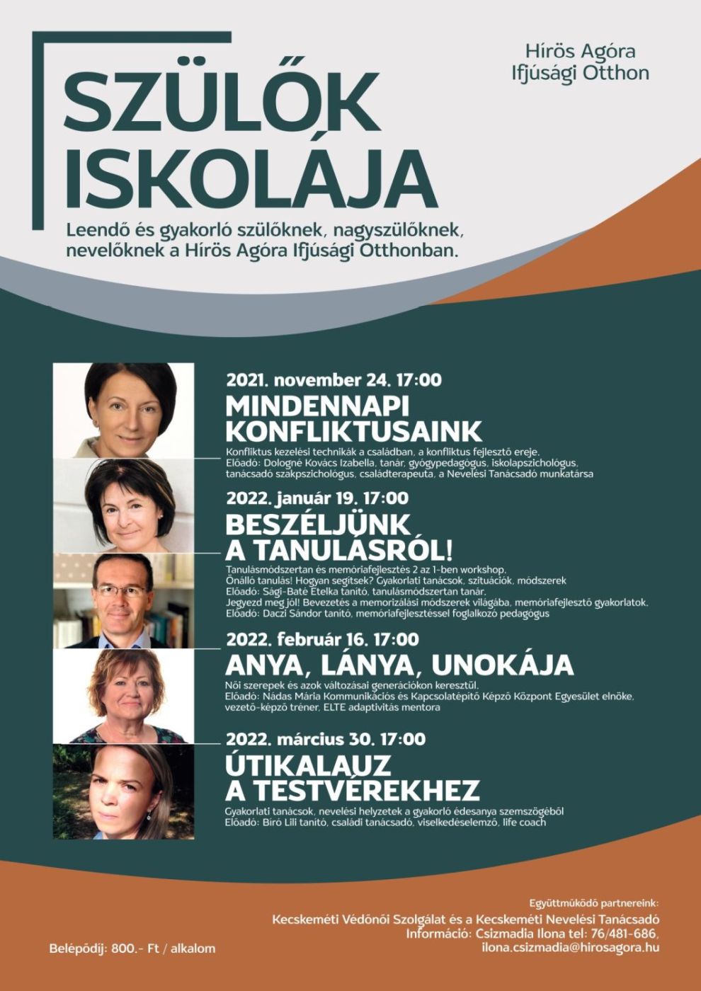 Leendő és gyakorló szülőknek, nagyszülőknek, nevelőknek a Hírös Agóra – Ifjúsági Otthonban (Kecskemét, Kossuth tér 4.)